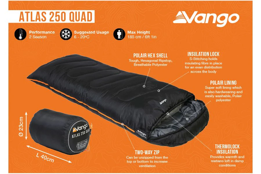 The Vango Atlas 250 Square sleeping bag is an entry level sleeping bag which is perfect for first time campers or for a festival. It has all the features which you would expect from a Vango sleeping bag but at an affordable price.